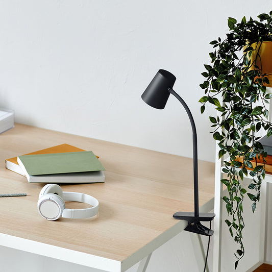 A clip-on lamp with a conical shade, built-in LED, gooseneck arm, and a dimmer switch located on the clip. The maximum clip span is 2.5 cm and it features three-step dimming.