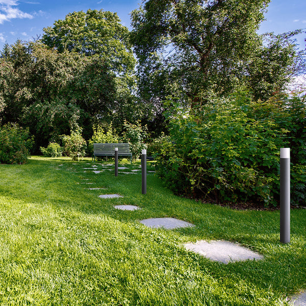 Massive outdoor bollard featuring wood decor on its sides. This bollard is designed for linear LED sources with an R7s 78mm base, accommodating diameters of up to 20mm.