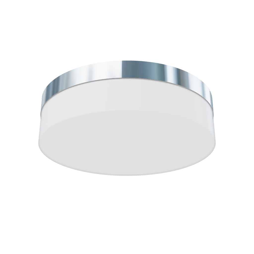 Ceiling light with integrated LED and an opal-colored glass shade. The ceiling base comes in chrome or matte nickel versions. Suitable for wet environments.