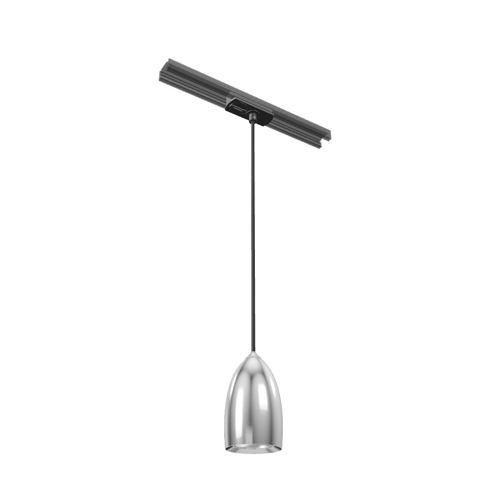 Pendant with a shade in chrome or matte nickel, a black textile cable and adapter for 1-circuit tracks.