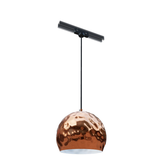 Pendant with a dented metal shade. The outside of the shade is copper-colored and the inside is white-lacquered. Supplied with a black PVC-cable with adapter for 3-circuit tracks.