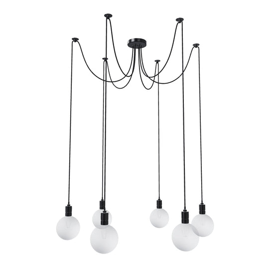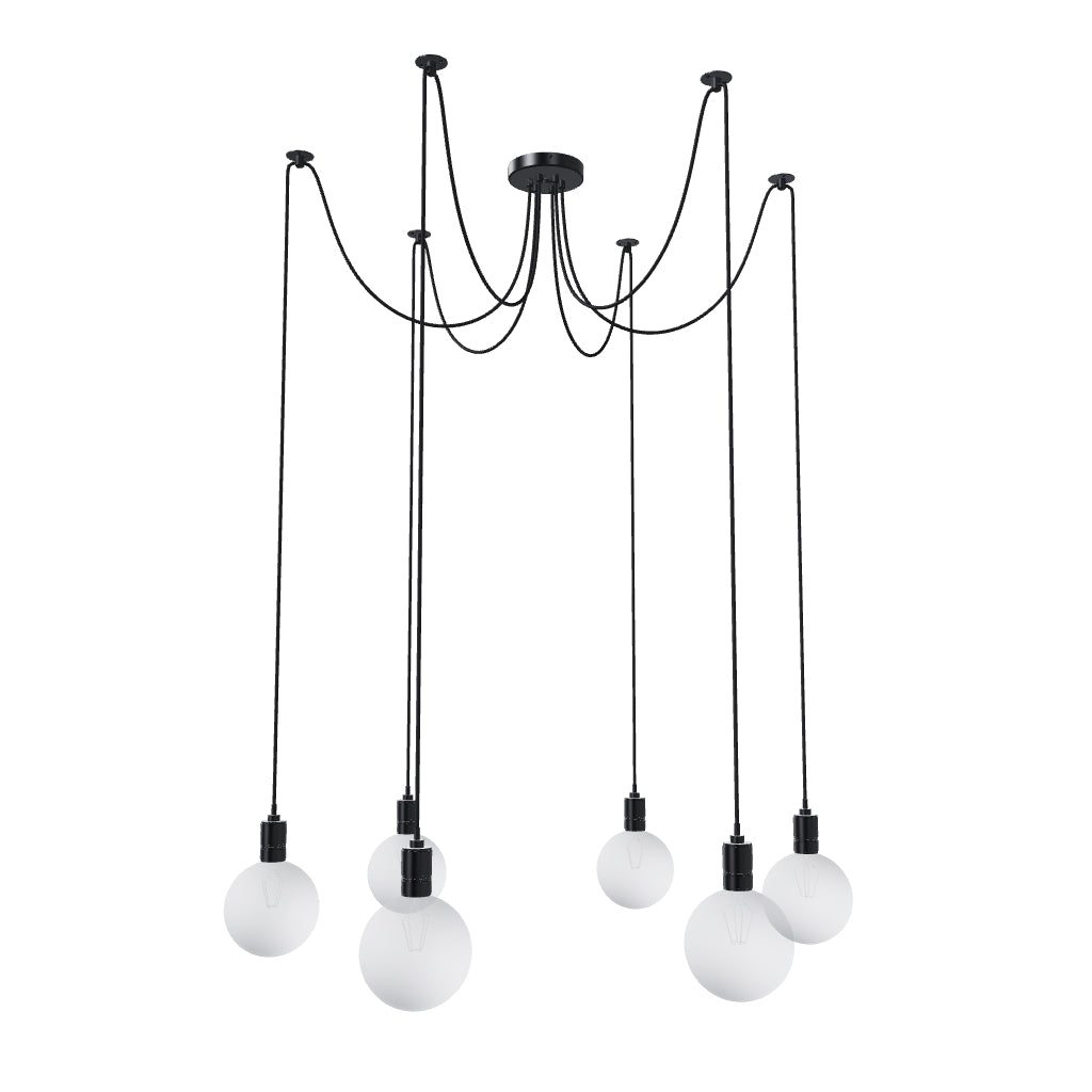 Pendant with a centralized ceiling base and six E27 sockets. The cords are attached to the ceiling individually and freely. The length of each cable is 2m.