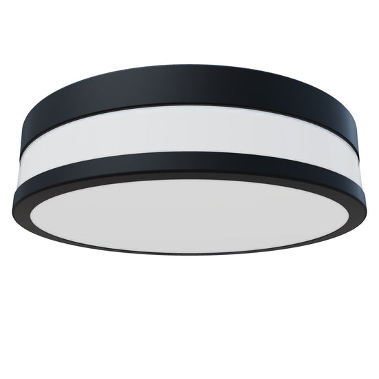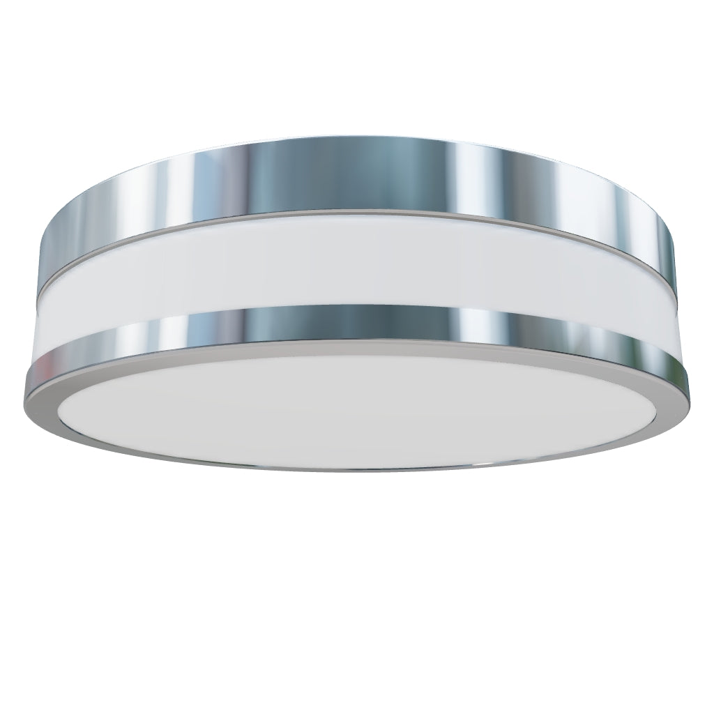 Round ceiling lamp with integrated LED, flat opal-colored glass and a metal frame. Suitable in wet environments.