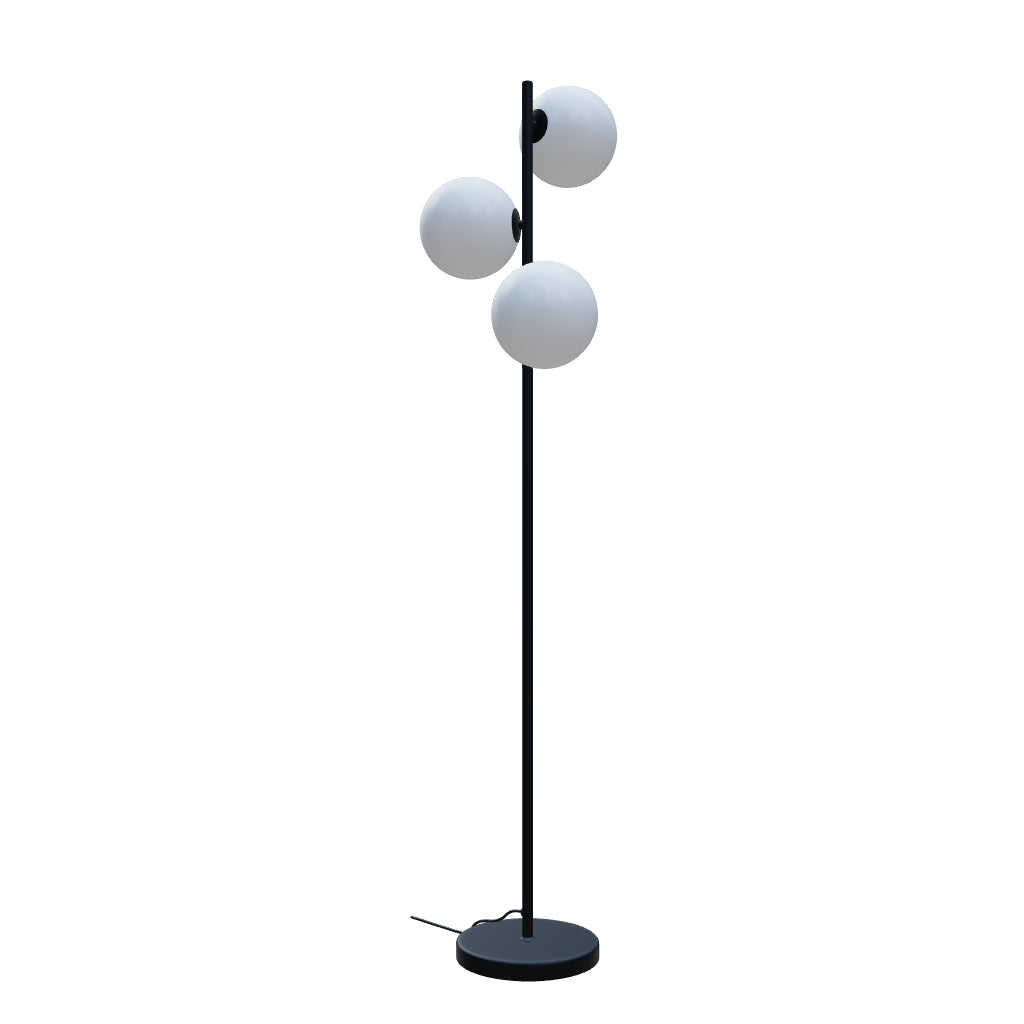 Floor lamp with three glass shades made of opal-colored glass on a black lacquered base. Suitable for G9 LED light sources.