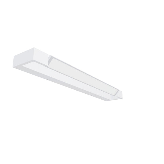 Linear LED light suitable above mirrors. The front part of the light can be turned around a horizontal axis. May be used in wet environments.