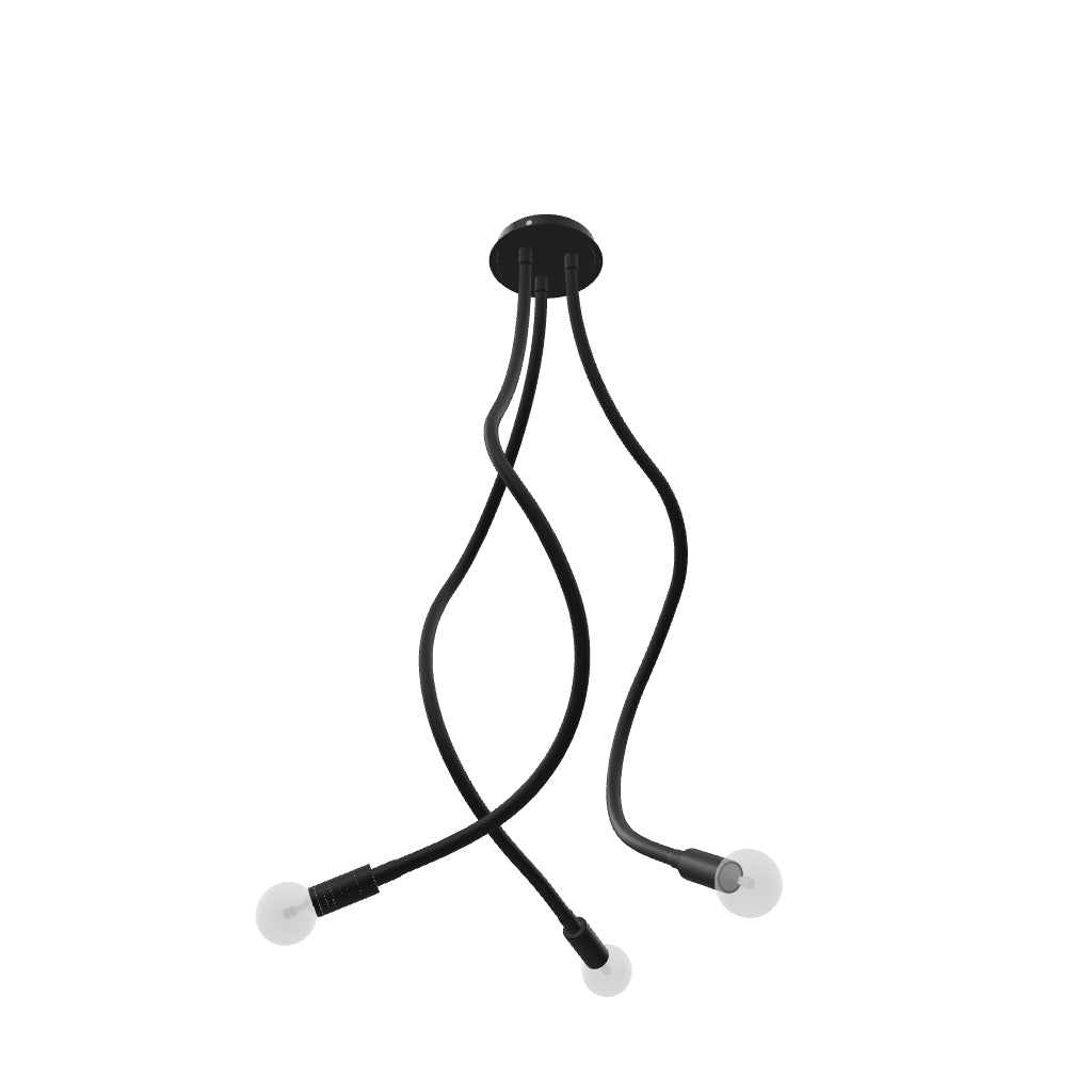 Ceiling light with three tentacle arms covered by a silicone casing, adjustable in all directions. For use with E27 decorative or reflective light sources.