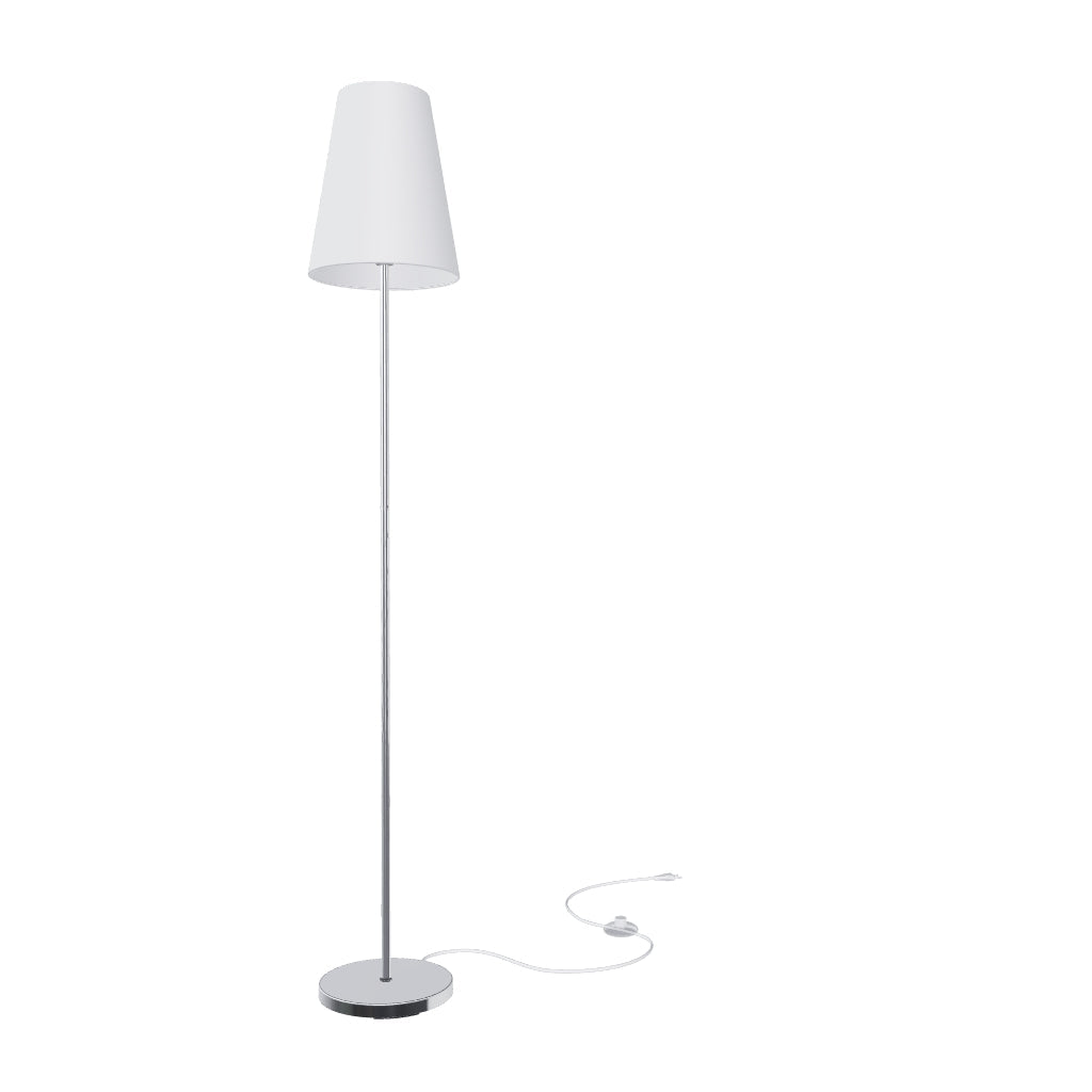 A floor lamp with a chrome base and a fabric shade. Suitable for LED E27 light sources.