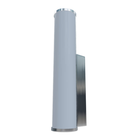 Cylindrical wall lamp with built-in LED and an opal-colored shade on a chrome base. Suitable for wet environments.