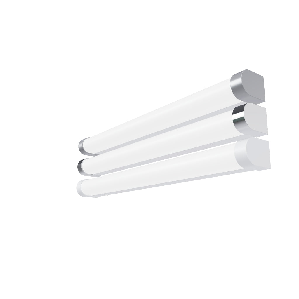 Linear bathroom light with integrated LED suitable above mirrors, with the option to purchase end-caps in different colors (R12906, R12907, R12908).