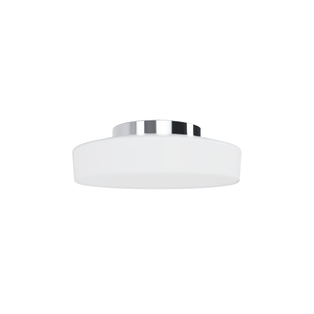 LED ceiling light of opal-colored glass on a chrome-plated base. Suitable for use in bathrooms.